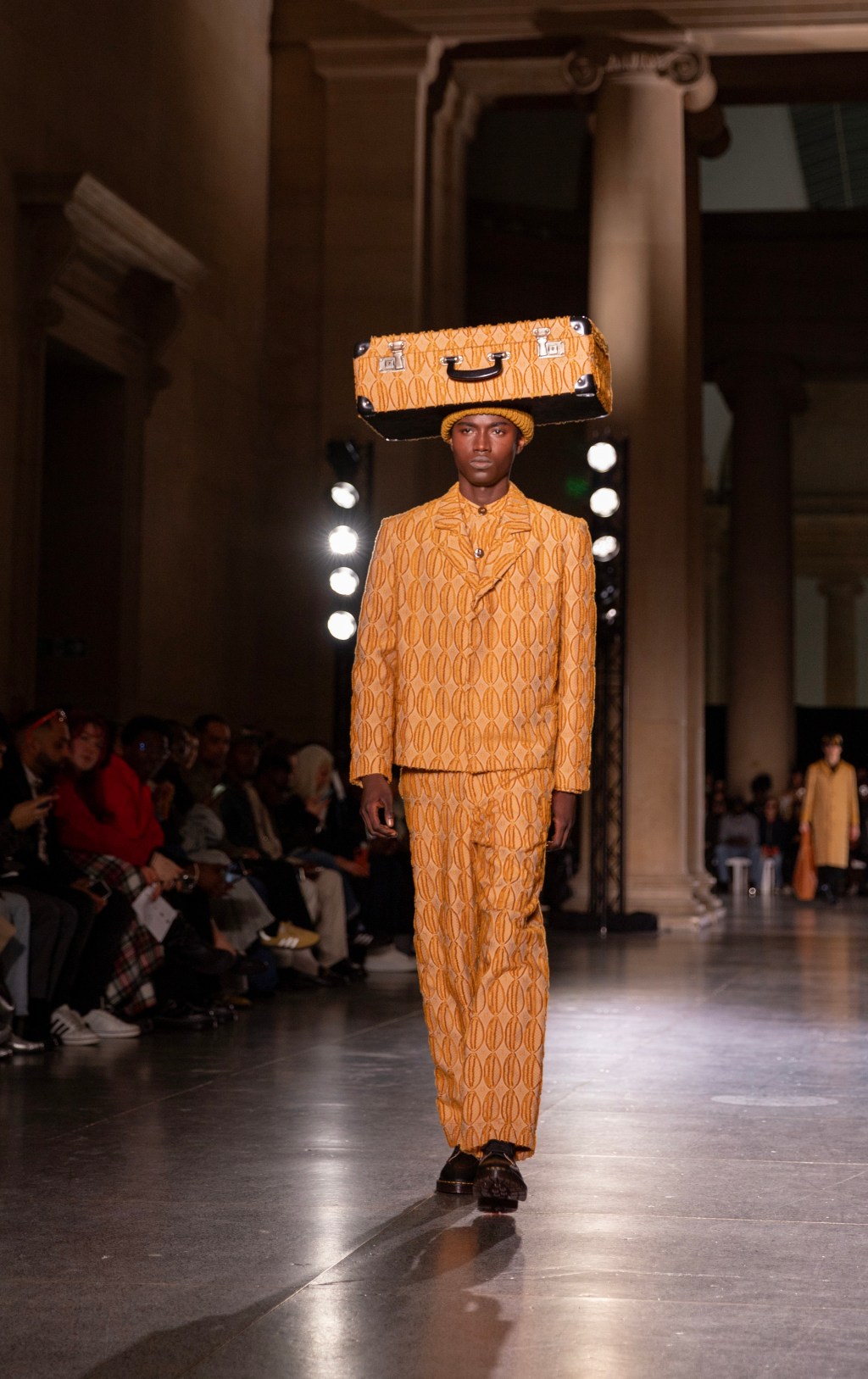 Accessories play a pivotal role in the collection, serving as a tribute to the journeys undertaken by courageous individuals worldwide. Vintage suitcases wrapped in LABRUM’s monogram fabrics evoke a sense of nostalgia and regal quality, while kufi-style crowns and patchwork buckets fuse global style influences with contemporary design.