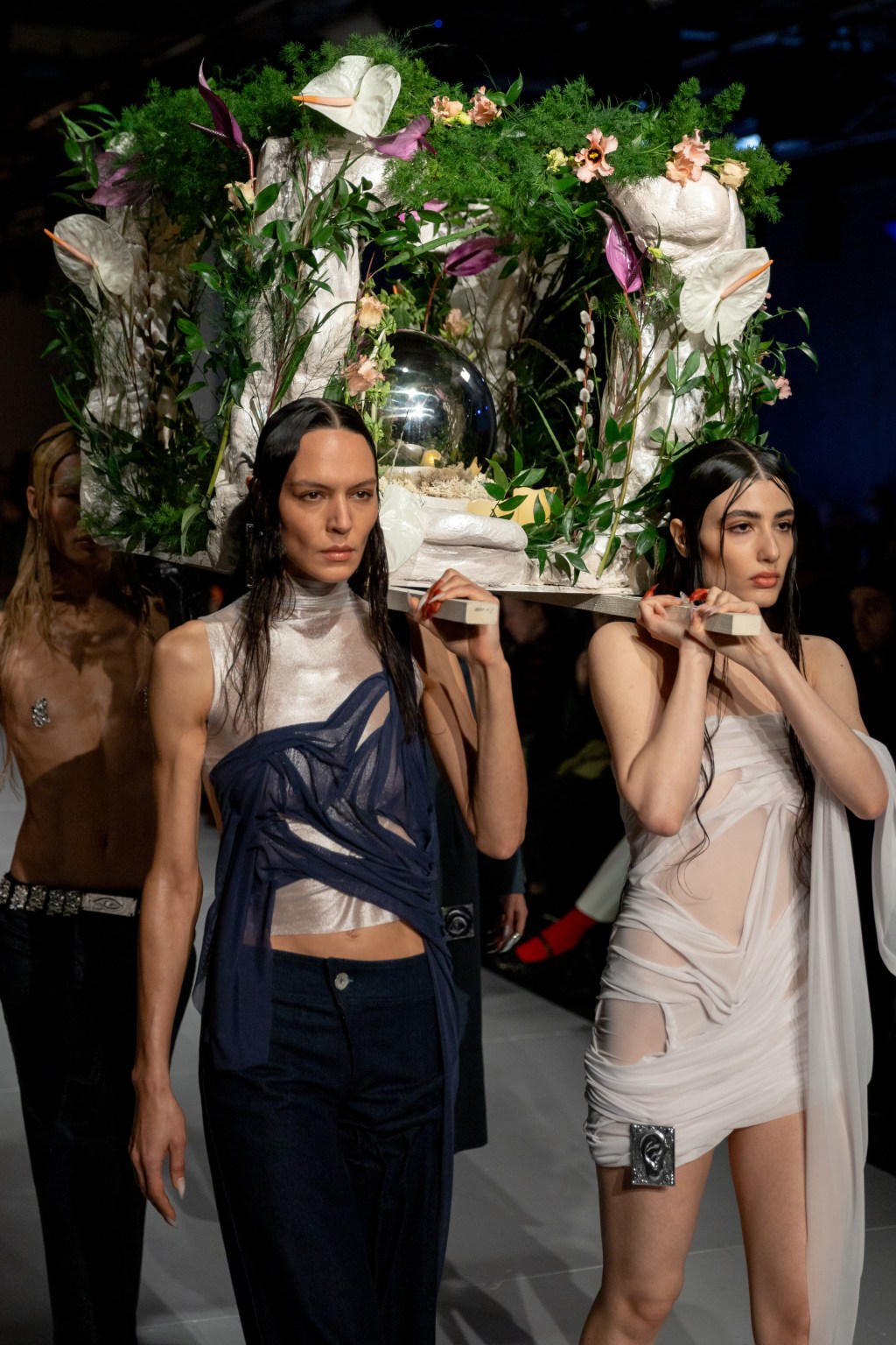 Yet it is in the culmination of the performance that the true essence of “The Body as Prayer” is revealed—a sacred union of flesh and fabric, of spirit and form. Two models, bare and unadorned, meet in the centre of the runway, their bodies merging in a tender embrace. As one steps inside the other’s dress, two souls become one, the birth of our inner child—a moment of pure, unbridled divinity.